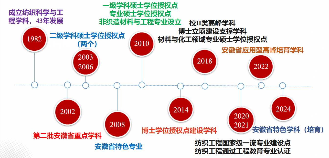 强化学科建设龙头地位,对标博士学位授予点基本条件,加强学科内涵建设。2022年纺织科学与工程学科获批安徽省应用型高峰培育学科,2024年纺织材料学科获批安徽省特色培育学科,2025年纺织科学与工程学科获批安徽省类高峰学科。