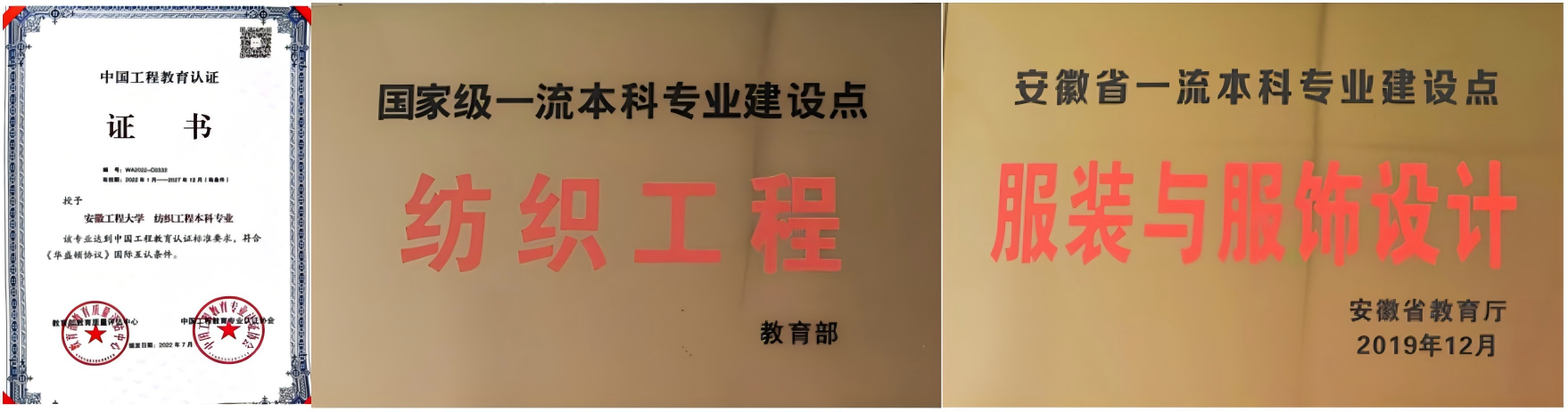 专业建设成效突出。纺织工程专业入选国家级一流本科专业建设点、获批省级卓越工程师教育培养计划并已通过教育部工程教育专业认证。服装与服饰设计专业为安徽省综合改革试点专业及安徽省一流本科专业建设点。纺织工程、轻化工程、服装设计与工程等专业均为安徽省特色专业,服装设计与工程专业已提交工程教育认证自评报告。学院为安徽省轻工纺织类专业合作委员会主任单位。实践平台继续拓展,获批省级示范实验实训中心。