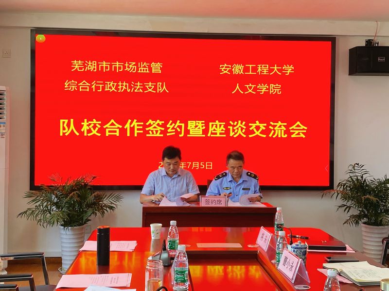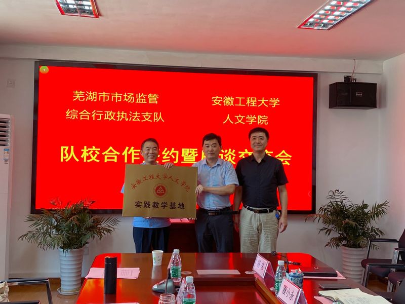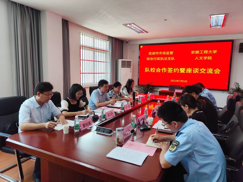 7月5日上午,为深入推进法学专业教育与法治实践深度融合发展,持续深化“政、产、学、研”协同育人成效,提升学生社会实践技能,我院与芜湖市市场监管综合行政执法支队举行合作签约暨实践教学基地揭牌仪式。芜湖市市场监督管理局党委委员、副局长查为民,芜湖市市场监管综合行政执法支队党支部书记、支队长曹小永,人事教育科科长昂雯丽,副支队长许丁宏,学院副院长张勇,法学系主任杜蓓蕾,教学办公室副主任董文静等参加签约仪式。签约仪式由芜湖市市场监管综合行政执法支队副支队长将来主持。