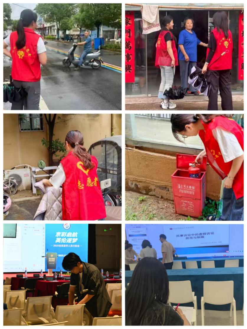 在淮南市田家庵区国庆街道纺织社区,服务队成员法学231李亦涵协助社区工作人员,开展社区空巢老人进行入户慰问及社区环境清洁等行动;在北京市朝阳区,服务队队长法学232张宝丰为“京彩启航 英伦筑梦”2025全英留学人员行前会提供全程志愿服务工作,以专业细致的服务为会议注入温暖力量;在芜湖市南陵县何湾镇绿岭村,服务队联合学院“岭上春风”志愿服务队,开展村庄清洁、慰问老人等志愿服务活动,以“青春力量”为基层治理添砖加瓦。