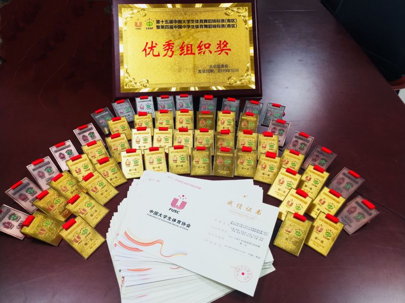 我校体育学院15名学生组成的体育舞蹈代表队在教练叶子老师和许诚老师的带领下,参加了大学专业B组的单人及集体项目,经过两天的激烈角逐,我校学子力克群雄,共获得冠军5项、亚军5项,季军4项,第四名3项,第五名1项,第六名1项,第八名2项的好成绩。其中谷胜乔、徐珂两位同学荣获大学专业院校B组单项C第一名、单项P第二名和大学专业院校B组五项L第四名;张宇、张笛两位同学荣获大学专业院校B组单项Q第二名和“优秀运动员”称号,团体赛中也是一鸣惊人,荣获四个第一名!我校学生凭借扎实的专业技术和严格的纪律赢得了荣誉,也赢得了对手的尊重和组委会的高度认可,荣获“优秀组织奖”。
