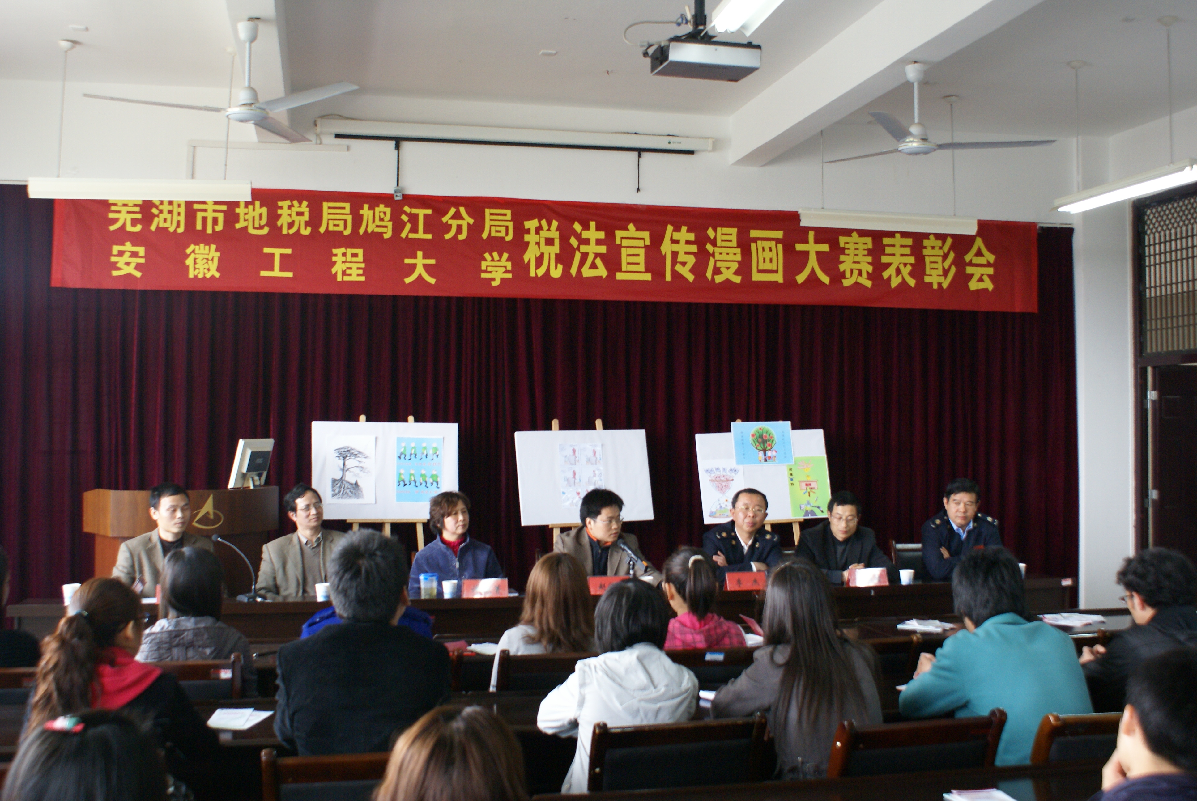 4月23日下午,芜湖市地税局鸠江分局与我校财务处、艺术设计系共同在艺术设计系会议室举行税法宣传漫画大赛表彰大会。省、市(分局)地税局领导,我校财务处、艺术设计系领导及参赛选手等出席了表彰大会,芜湖市电视台、广播电台、芜湖日报社等多家媒体进行了现场采访和报道。会议由财务处处长助理方永胜主持,艺术设计系党总支书记许晓菁、省地税局办公室主任赵俊峰、鸠江区地税分局局长李杰、财务处处长陈跃东等分别在会上作了讲话。