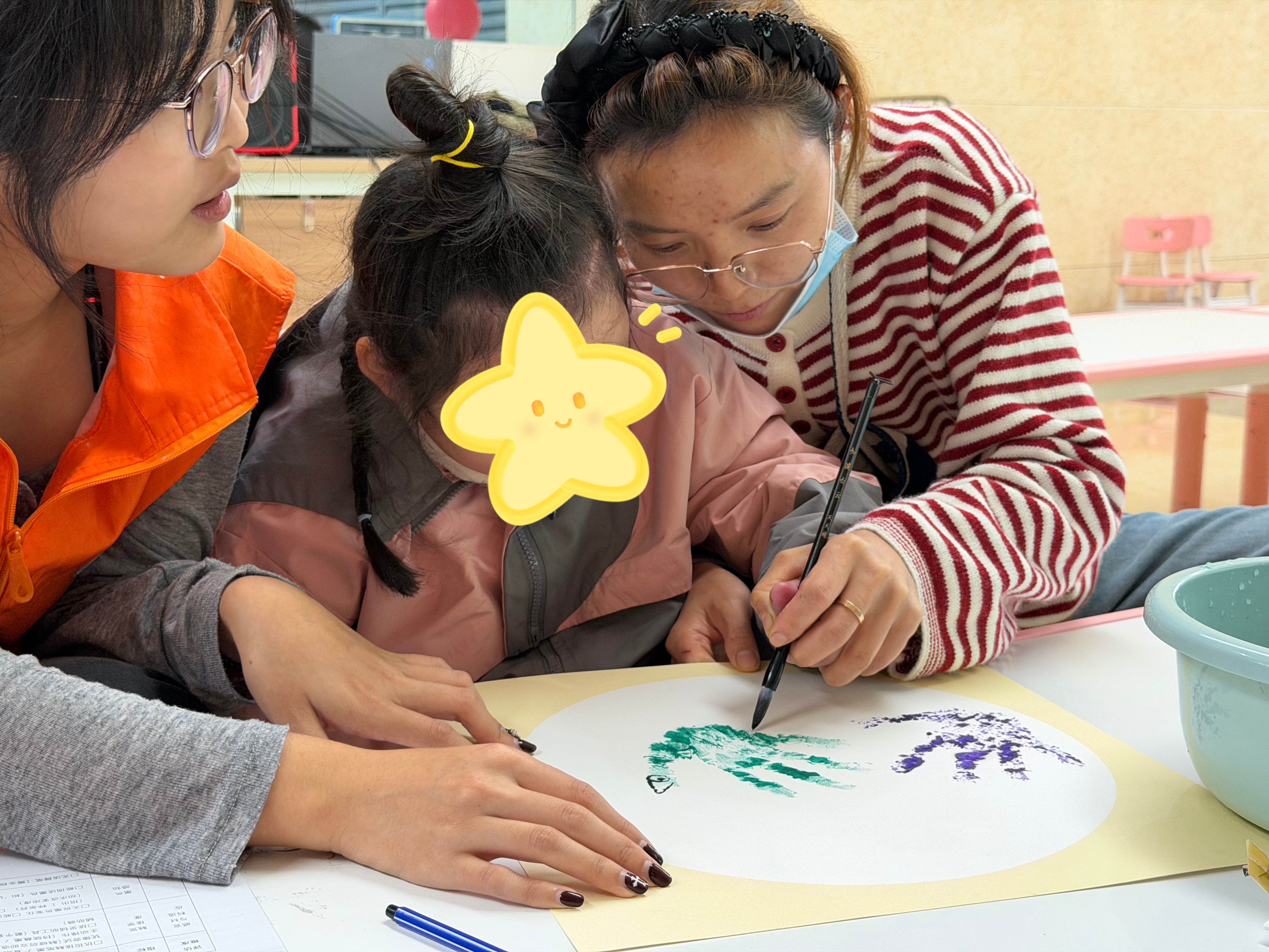在志愿者的悉心引导下,活动逐步展开。孩子们首先参与“手掌画”创作,以手为型,以心为笔,在铺展的宣纸上勾勒轮廓、点染色彩。随后进行的“大熊猫”主题集体创作,则将现场气氛推向高潮。他们以墨为韵,以彩为言,在浓淡干湿的笔墨变化中,绘就出一幅幅憨态可掬、充满生命力的作品。整个创作过程秩序井然而又生动活泼,孩子们专注的神情与不时绽放的笑容,成为现场最动人的风景。
